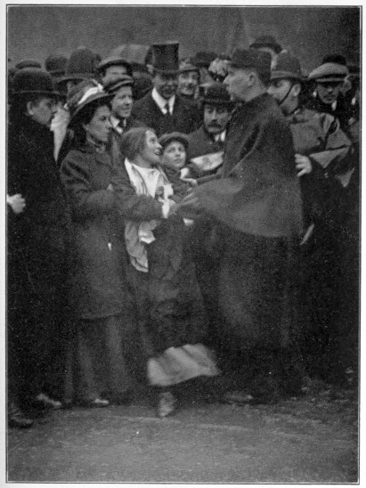 The Autumn Session lasted but a few days, for on November 18, Mr. Asquith announced that Parliament would be dissolved on November 28th, and that a general election would take place. Even whilst he spoke, the women,—450 of them, divided into companies of less than twelve to keep within the law,—were marching from the Caxton Hall and Clement's Inn. Mrs. Pankhurst, Dr. Garrett Anderson, founder of Girton College and one of the medical women pioneers now over seventy years of age, Mrs. Hertha Ayrton, the scientist, Mrs. Cobden Sanderson, and Miss Neligan and Mrs. Brackenbury, both of whom had reached the great age of seventy-eight, were amongst the first little band. They soon learnt that the Prime Minister had refused to see them. Some of their number were hurled back into the crowd. The remainder were kept standing on the porch for hours with the shut door before them and a surging crowd behind.