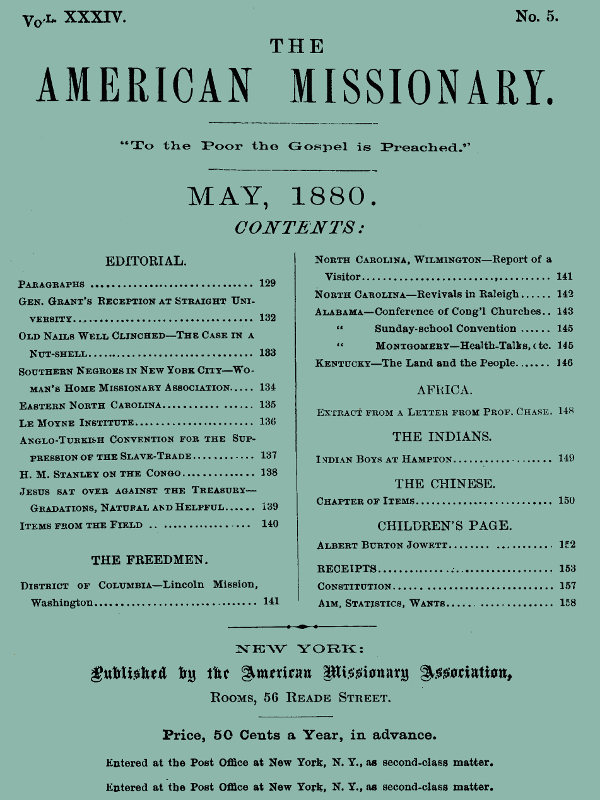 As we make our bow after the above graceful introduction by our honored Senior Secretary, we are conscious that all eyes are turned regretfully toward the departing, rather than hopefully to the incoming, Editor. We are in the position similar to that of a new minister, who is told as he makes his first pastoral visits, “We never expect to love another pastor as we loved Mr. B.” We are glad for all that makes our position difficult, and suggest as the only remedy for the loss the Missionary must otherwise sustain in the retirement of Mr. Boynton, that all who feel it, shall make the appropriate effort to prevent it. Let our teachers and missionaries understand, that they must come to the rescue by prompt and faithful reports of every phase of their work; giving us rich material from which to select what, from our stand-point, appears the thing to be said at any given time. Let Pastors and Superintendents, and other co-laborers, feel that they must stand between this work and loss, and double their diligence, and quicken their zeal, in keeping their churches and schools informed and 130 interested; and, finally, let all who have felt an impulse to give more, show their appreciation of the late Editor’s good work by such an increase of gifts, as shall meet the urgent demands on our Treasury; and in reporting all this, we promise the most interesting numbers of the Missionary yet published. Thus: