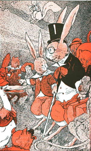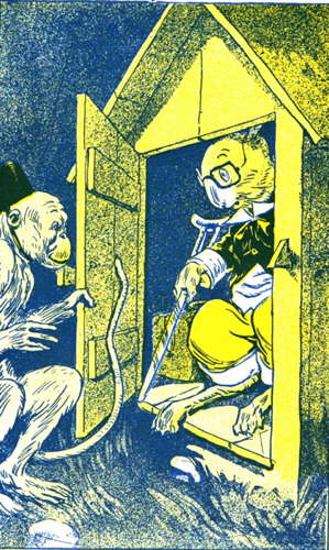 "Oh! that is a very nice song, birdies," said the rabbit, as he took off his hat and made a low bow. "But," he went on, "I don't know as I care for red monkeys who do tricks. What in the world would I do with them?"