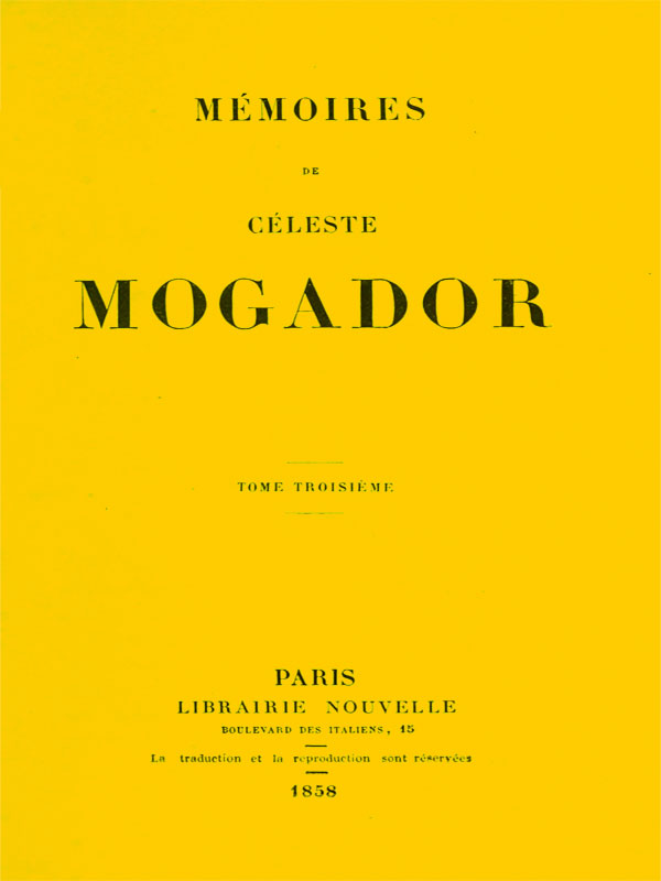 The Project Gutenberg EBook of Mémoires de Céleste Mogador, Volume 3 (of 4), by Céleste de Chabrillan This eBook is for the use of anyone anywhere in the United States and most other parts of the world at no cost and with almost no restrictions whatsoever. You may copy it, give it away or re-use it under the terms of the Project Gutenberg License included with this eBook or online at www.gutenberg.org. If you are not located in the United States, you'll have to check the laws of the country where you are located before using this ebook. Title: Mémoires de Céleste Mogador, Volume 3 (of 4) Author: Céleste de Chabrillan Release Date: July 2, 2017 [EBook #55023] Language: French Character set encoding: ISO-8859-1 *** START OF THIS PROJECT GUTENBERG EBOOK MÉMOIRES DE CÉLESTE MOGADOR *** Produced by Clarity, Hélène de Mink, and the Online Distributed Proofreading Team at http://www.pgdp.net (This file was produced from images generously made available by The Internet Archive/Canadian Libraries)