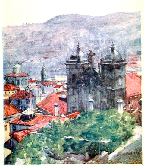 Away from the river-side and the immediate surroundings of the cathedral, Oporto has little to show in the form of architectural quaintness. A busy, bustling place of modern-looking houses for the most part, the streets dominated by the indispensable electric tramways, casting scorn upon the lumbering ox wains that alone compete with them. Yet the city has some striking points that should not be missed. The view is very fine, for instance, from the top of the main modern shopping thoroughfare, the Rua de S. Antonio, which swoops down suddenly like a giant switchback to the Praça de Dom Pedro, the centre of the city, and then as the Rua dos Clerigos soars aloft again as suddenly to another eminence crowned by the extraordinary 25tower of the Church of the Clerigos, one of the loftiest spires in Portugal. The effect, looking up on either side from the Praça de Dom Pedro, is as curious as any streetscape of its kind in Europe. The Praça de Dom Pedro itself, crowded almost day and night with people, busy and idle, is a typical Portuguese “place,” paved, as most of them are, by the strange wave pattern in black and white stone mosaic that gives to the Praça de Dom Pedro in Lisbon (the Rocio) the English name of “rolling motion square.”