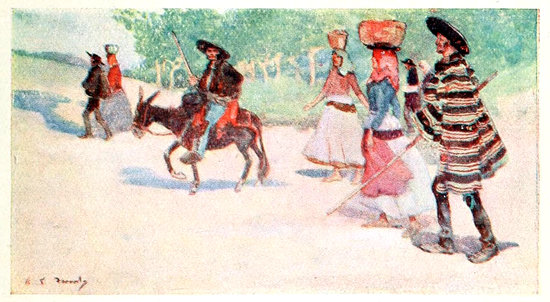 29The manners of these people of North Portugal, indeed, are irreproachable. So courteous are they that it seems almost rude of the stranger to note too closely the quaint garb of the working people around him. The peasant women especially keep their ancient costume unchanged. Barefoot they go, old and young, with their heavy burdens piled in their boat-shaped baskets upon the black, pork-pie hats they wear. Their skirts, usually black but often with a broad horizontal stripe of colour round the bottom, are very short, and gathered with great fulness at the waist and over the hips. Upon the shoulders there is almost invariably a brilliantly coloured handkerchief, and sometimes another upon the head beneath the hat; and long, pendant, gold earrings shine against their coarse jet-black hair. It is evident that for the most part they work quite as hard as the men, but they have no appearance of privation or ill-treatment, except that their habit of carrying heavy weights upon their heads has the effect of ruining their figures in the manner already described. There are no indications anywhere of excessive drinking, and even smoking is not conspicuous amongst the 30working men and boys in the streets; they seem, indeed, too seriously busy for that, except on some feast day, when, with their best clothes on, they are gay enough, though not vociferous even then, as most southern peoples are.