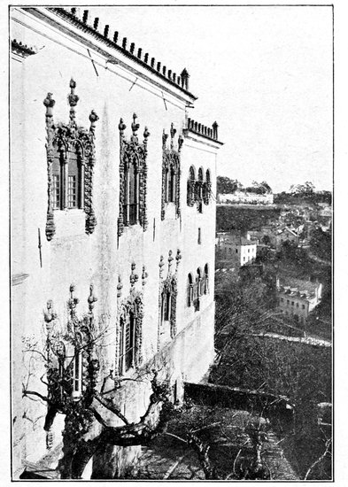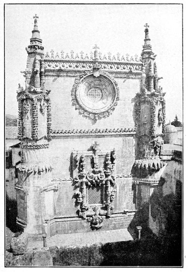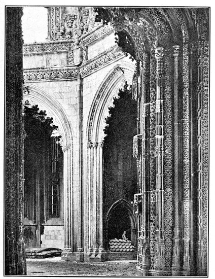 A long line of church and monastery adjoining runs parallel with the sea, the conventual portion partly in ruins but now in course of reconstruction, and the eye is at first perfectly bewildered by the richness of the details of the doors and windows of the edifice. Here Manueline architecture is at its earliest and best, before extravagance like that of the unfinished chapels at Batalha overwhelmed it. Here the orthodox florid Gothic and Renaissance styles are leavened, but not obliterated, by the new spirit of expansion and aspiration that found its national expression in what is called Manueline. The west door of the church, where the monastic buildings join it, is extremely beautiful. On each side are rich canopies under which kneel the king and queen with their patron saints, and smaller figures exquisitely carved surround the rest of the door, which is surmounted by flamboyant pinnacles in the Manueline taste. The general idea of the windows, which are 238very large and high, is of a round-topped arch three or four courses or orders deep, each course being set with bosses of a different, but always elaborate, pattern, an outer moulding representing a twisted cable or twined branches in infinite variety, ending in a series of pinnacles, surrounding the window on the surface of the wall.