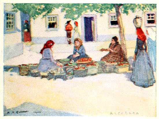 235The male fish-sellers of Lisbon are for a wonder even more picturesque than the women; for here on the Tagus the seafarers of the south are first noticeable, quite distinct in racial characteristics as they are from those of the north. These Lisbon fishermen go barefooted, which the poorest men of the north never do, they wear breeches only to the knee, girt by a crimson sash, and the hanging tasselled bag-cap falls and waves over their shoulder as they loup along with a peculiar springing gait under a long flexible pole balanced transversely across the shoulders, at each end of which a flat, shallow basket of fish is suspended. The vegetable market adjoining that devoted to fish is a brilliant sight in this favoured land. Heaps of scarlet pimentos and tomatoes are flanked by enormous yellow gourds, and mountains of purple grapes incredibly cheap, pomegranates, and big luscious pears jostle piles of humbler vegetables of the kitchen, and some of the groups of bright-coloured produce seem to reproduce the old pictures of the mythical cornucopia 236overflowing with all the best fruits of the earth.