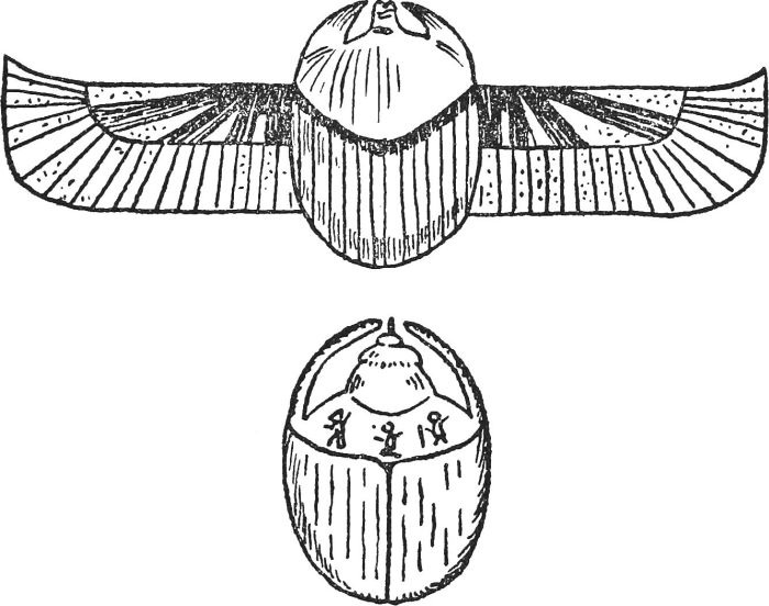 No. 2.—An Egyptian Scarab, such as were used as talismen. Two forms are shown, one with the pectoral wings outspread; the other, with wings closed.