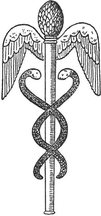 THE CADUCEUS.—This device, which figures as part of the design of[9] some postage stamps, has been considered a bringer of good fortune ever since the time of the ancient Greeks. It consists of two snakes entwining a rod, surmounted by a pine cone. By the side of the cone is a pair of wings. It was the symbol of Mercury. The rod had the supernatural powers of quelling disputes and letting people dwell in harmony. The snakes possessed the property of healing; the pine cone preserved good health; and the wings stood for speed and progress. Thus people wear the caduceus today in order to ensure a life free from quarrels and illness, and to enable them to be healthy and "go ahead."