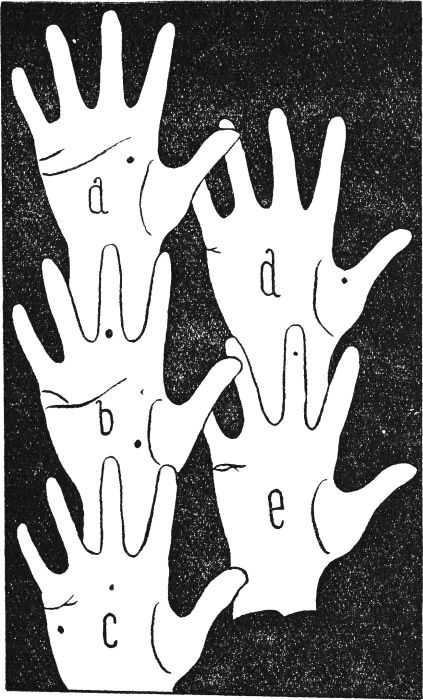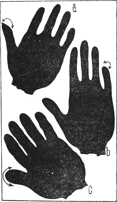 ELASTICITY OF THE HAND.—This is best tested by actual grip (as in shaking hands). All hands naturally present some feeling of elasticity; this is a matter of comparison, but it is very easy to tell the quick, virile grip of an elastic hand to the dead fish feeling which a flabby hand gives us when we grasp it.
