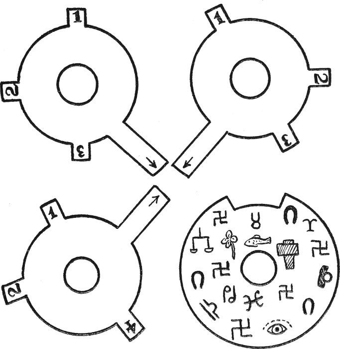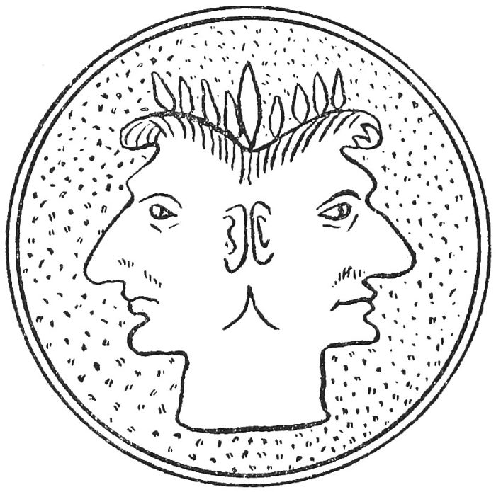 THE SCARAB.—This device is accounted very lucky or very unlucky, according to the disposition of the wearer. The symbol represents the[8] scarab beetle with its wings outspread or with them closed. Such charms are made to-day in large numbers for sale in Egypt, but those who trade in them usually claim that each particular specimen has been in the family since Biblical times. As a rule, the device is made in a rough kind of bluish porcelain and is carved, in intaglio, with divine figures. The Egyptians used to make up the scarab as a neck pendant or as a little ornament for placing in the coffins of the dead. Its mission was to scare away the evil one.