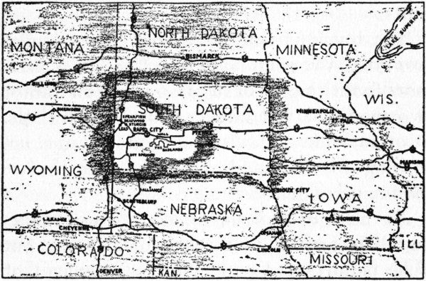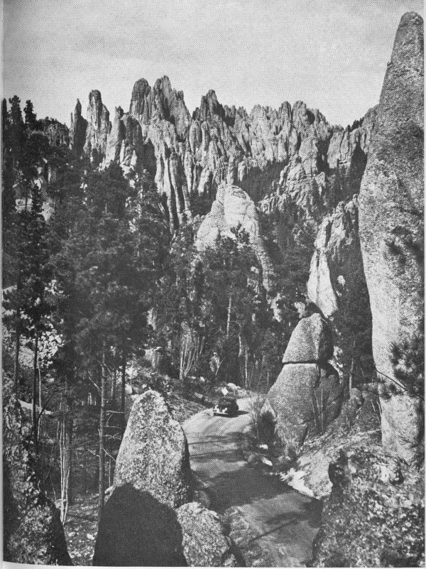 From the east U.S. 14 and 16, again, bring the tourist through Pierre, on the Missouri River, past the Badlands, and into the Hills through Rapid City. From Minneapolis the distance is just over six hundred miles, while from Chicago it is very nearly a thousand.