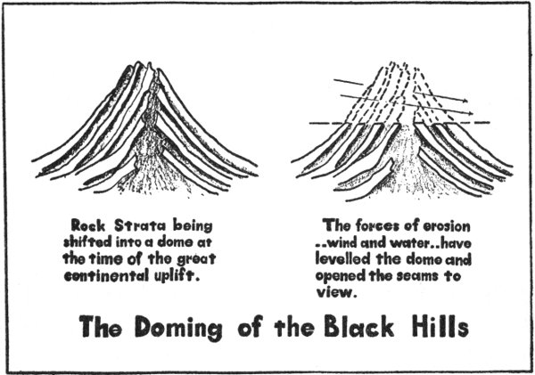 The Hills, which is to say the rock substances of the region, are older by hundreds of millions of years than the stone out-juttings of the Rocky Mountains. Layer after layer of slates and schists from the very foundations of this globe lie visibly exposed as the end result of a doming of the region, a vast blistering, as it were, which raised the entire structure, layer 16 upon layer, several thousand feet in the air. Following this doming process, a vigorous program of erosion commenced. Stratum by stratum the winds and rains cut across this huge blister in a horizontal plane, eventually laying the core open at the height above sea level at which we find the Black Hills today. From that core, extending in every direction in the general form of a circle, the various strata which once lay so smoothly one upon another have been laid open as one might slice off the top of an orange.