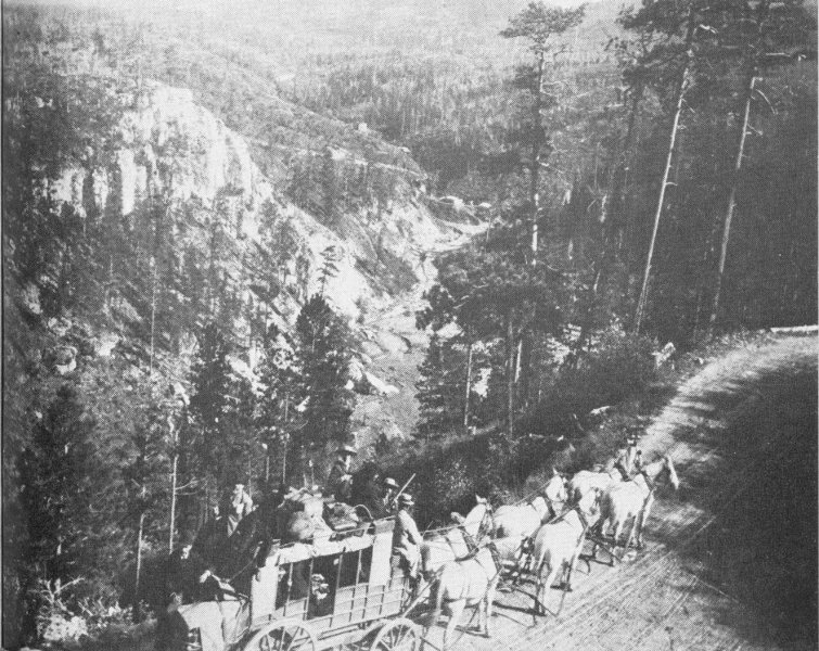 As the tourist enters the town he will immediately be amazed by the wide main street; but if he ponders for a moment the problems of turning a freight wagon behind sixteen oxen, the reason will become clear. Custer, the western gateway to the Hills, was, until the coming of the railroads, a major way station on the busy Cheyenne-Deadwood stage and freight route; and for fifteen years the great bull wagons teamed into this busy center where, in most cases, the goods were unloaded and trans-shipped by lighter wagons into the various mining centers throughout the northern and central Hills.