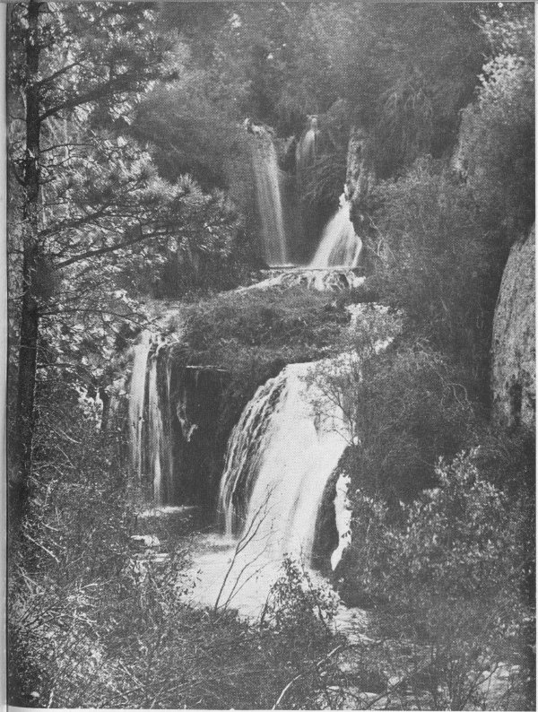 The town is located in a large bowl of the southern hills known as the Vale of Minnekahta, from the Sioux name for “warm waters.” Situated as it is on the rim of the Hills region, it was not included in the general taboo that cloaked the rest of Paha Sapa to the north; and for nearly a century before its discovery by the white man in 1875, it was a favored health resort of the Indians. As a matter of fact, Battle Mountain, which overlooks the town, takes its name from a legendary war between the Sioux and the Cheyenne for the exclusive privileges of the hot baths.