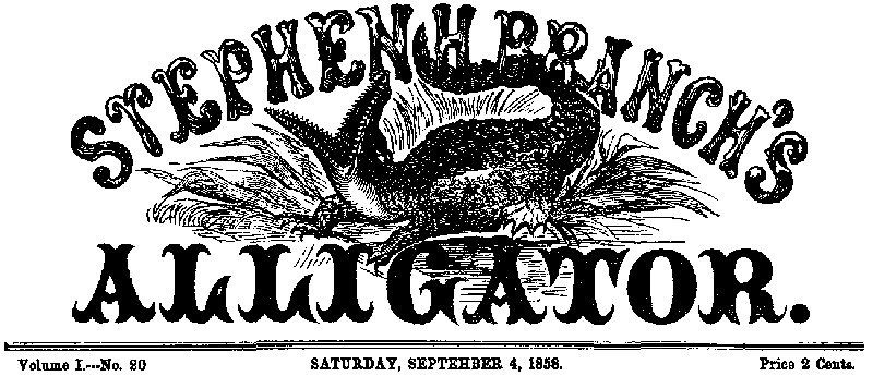The Project Gutenberg EBook of Stephen H. Branch's Alligator Vol. 1 No. 20, September 4, 1858, by Stephen H. Branch This eBook is for the use of anyone anywhere in the United States and most other parts of the world at no cost and with almost no restrictions whatsoever. You may copy it, give it away or re-use it under the terms of the Project Gutenberg License included with this eBook or online at www.gutenberg.org. If you are not located in the United States, you'll have to check the laws of the country where you are located before using this ebook. Title: Stephen H. Branch's Alligator Vol. 1 No. 20, September 4, 1858 Author: Stephen H. Branch Release Date: July 11, 2017 [EBook #55090] Language: English Character set encoding: UTF-8 *** START OF THIS PROJECT GUTENBERG EBOOK BRANCH'S ALLIGATOR, SEPT 4, 1858 *** Produced by Richard Tonsing, The Online Distributed Proofreading Team at http://www.pgdp.net (This file was produced from images generously made available by The Internet Archive)