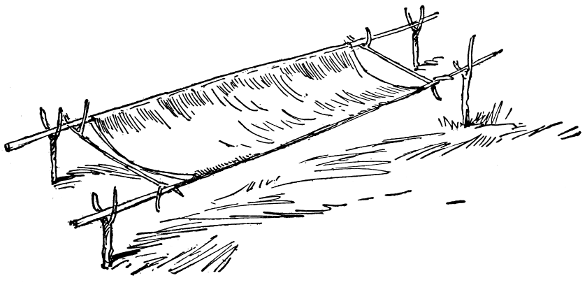 The same principle of rigid economy in selection will obtain in the check list for food. It is the minimum of expense in the woods that will bring the maximum of comfort.[6] In arranging for the “duffle” to be taken with you there is one thing that can be counted upon with mathematical certainty: hunger. You are going to be hungrier than you have been in a long time. The problem is, then, how to tote enough food and get enough food to supply your wants. The carriage, the keeping, the nutritive value, all these things have to be taken into consideration in wood life. At home we have fresh vegetables, fresh fruits, fresh meats in abundance. How can we supply these things for our camp table? We can’t! But desiccated potatoes, dried apples, apricots, prunes, peaches, white and yellow-eye beans, dried lima beans, peas, whole or split, onions, rice, raisins, nuts, white and graham flour, corn meal, pilot biscuit, rolled oats, cream of wheat, cocoa (leave coffee and tea at home), sweet chocolate, syrup for flapjacks, baking soda, sugar, salt, a few candles (helpful for lighting a fire in wet weather, as well as good[7] for illumination), matches, molasses, a little olive oil—all these things, with careful planning, we may have in abundance. To these items you should add good butter—the best salted butter is none too good—some cans of condensed milk and evaporated milk and cream, and a flitch of bacon. Meat makes a dirty camp, and a dirty camp means skunks and hedgehogs prowling around. In a properly thought-out dietary it will be entirely unnecessary to tote meat. All that is needed for use you can get at the end of your fish rod or through the barrel of your shotgun, and upon the freshness of what you catch or shoot you can depend. Dr. Breck, in his “Way of the Woods,” says that if he were obliged to choose between bacon and dried apples and chocolate, he would always take the apples and chocolate. Both portage and health will be served by avoiding the carriage of a lot of tin cans. The ration of each article needed you can work out with[8] your mother or housekeeper, according to the number of people to be in the party, the menus you plan, and the length of your stay. For a cooler for your food, you will find a wire bait box, sunk in clean running water, excellent. The question of grub, or duffle, as it is called in camp life, in proper variety, abundance and freshness, is the most difficult question of all. To this problem a seasoned camper will give his closest attention.