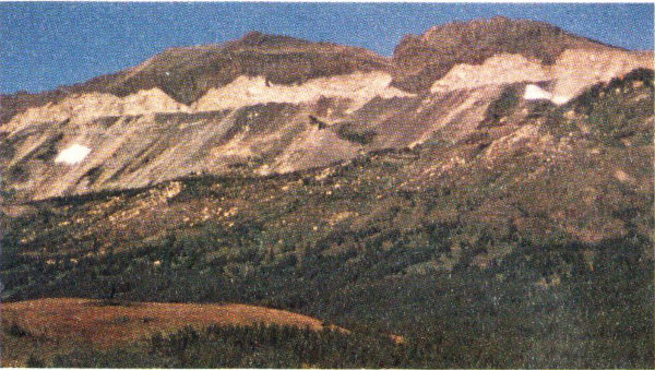 The peaks in this photograph (a view to the northwest from Marias Pass) are remnants of the overthrust block, which moved eastward. The dividing line between the light-colored rocks and the gray talus slopes beneath them is the Lewis Overthrust Fault.