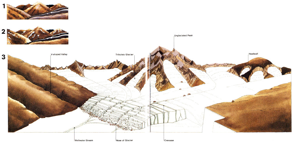 Now less than 3 minutes of film remain. The arrival of the ice is imminent. We look at the landscape of featureless mountains and wonder at the dramatic difference that this last 3 million years will make. We do not see the familiar forests and lakes, the savage peaks, and the broad, deep valleys of this present land. These mountains are gentle, arid, and shallow-valleyed. The vague outlines are there; we recognize the general alignments of the drainage systems, the bloated domes from which sharp peaks will be cut. The mountains are connected to one another by blunt ridges and smooth saddles, and the shadows they cast are dull, dunelike.