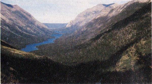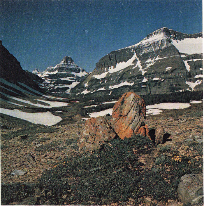 Hidden Lake, deep, far below, so blue, 8 fits into its cliffed, crooked valley like a polished boomerang. Closely ringed by ridge and peak—distant Sperry Glacier and pointed Gunsight peering up from the southern jumble, and broad Bearhat impossibly close—this lovely lake is almost lost amid such sharp proclamations of rock. Its outlet gorge gives a narrow view across the angled, hidden valleys of Avalanche and McDonald, past the pyramid of Stanton, to the low, faraway undulations of the Whitefish Range.