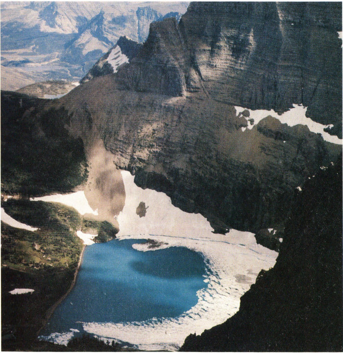 Sperry Glacier stares back at me from the flank of Gunsight. Glaciers found in the park today are not remnants of the last ice phase, which ended here about 8,000 years ago, but are newly formed, having come into existence some 4,000 years ago. They reflect a cooling trend in the present climate.