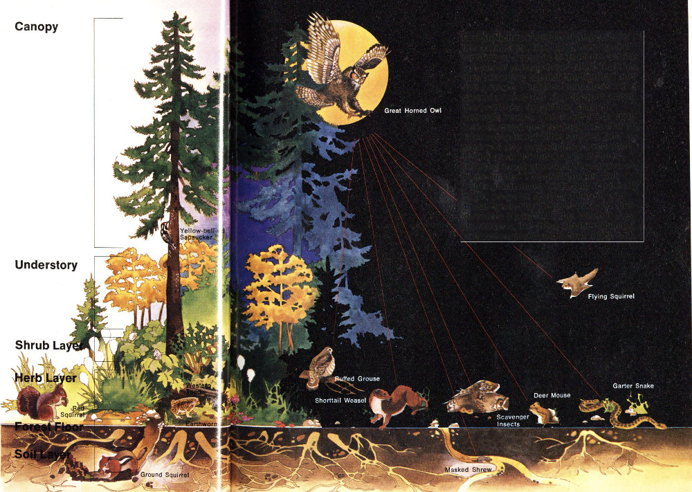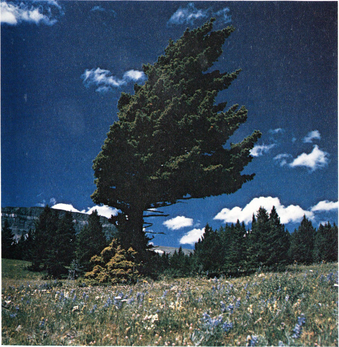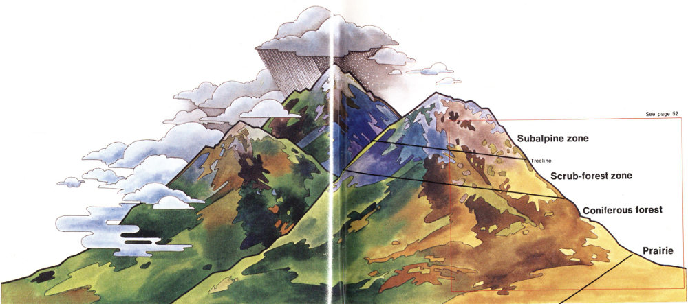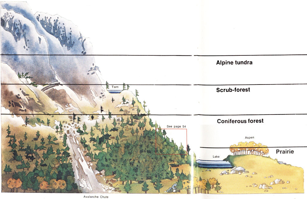 But the essential excitement of this land is more than cliff face, spire, and sudden storm. It comes to you when you realize that here is an aggregation of dramatically differing life zones, where a day’s walk can easily take you from prairie and forest to treelimit and tundra; where a dense forest of redcedar and hemlock, similar to the rain forests of the Pacific coast, exists a score of kilometers from the great prairie sea.
