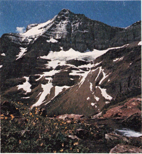 5 The Glacier landscape today. Throughout the millions of years during which the folding, faulting, and overthrusting have been taking place, the process of erosion has continued; a thousand meters of stratified rocks have been worn away, so that only a remnant of the overthrust layers can be seen today. Because Glacier’s eastern slope represents the eroded face of the overthrust block, the mountain range rises precipitously from the prairie, with no foothills breaking the abrupt transition from open prairie to mountain valley.