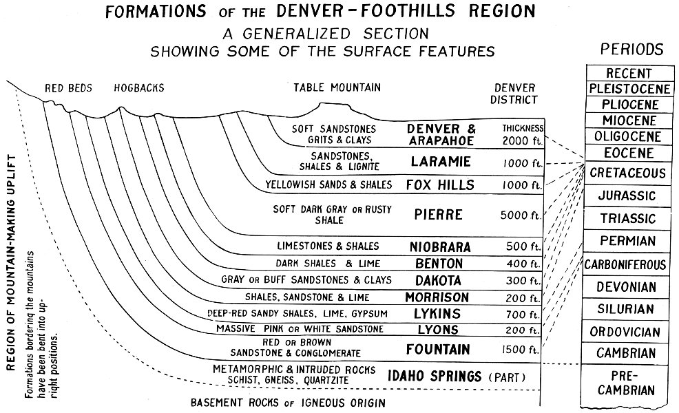 The “Dakota formation,” to use a convenient illustration, is mentioned in scores of reports bearing on the geology of Colorado, Iowa, Kansas, Nebraska, New Mexico, Texas, Utah, and Wyoming, as well as the Dakotas. On the geological map of Colorado it appears on both sides of the Rockies, scattered in strips and patches from north to south boundary lines. The beds are easily located in the foothills district west of Denver because of their tendency to produce the prominent ridges known as hogbacks.