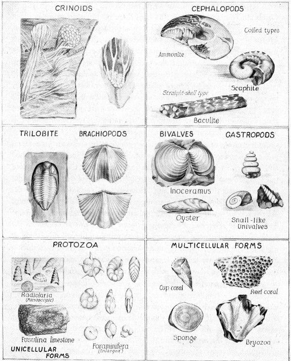 “How old are they?” “How can you learn their names from the rocks?” These are typical examples of questions most frequently asked concerning fossils. The second question follows the usual reply to the first, for prehistoric plants and animals are as old as the rocks in which they are found. The answer, as to age, must come from the rocks and what we have learned about them through many years of hard work, thoughtful observation, and careful study. Names, however, come from a different source. Nature, apparently, managed for a long time to carry on without the use of words. Since man began talking he has had no trouble inventing names for things which interest him.