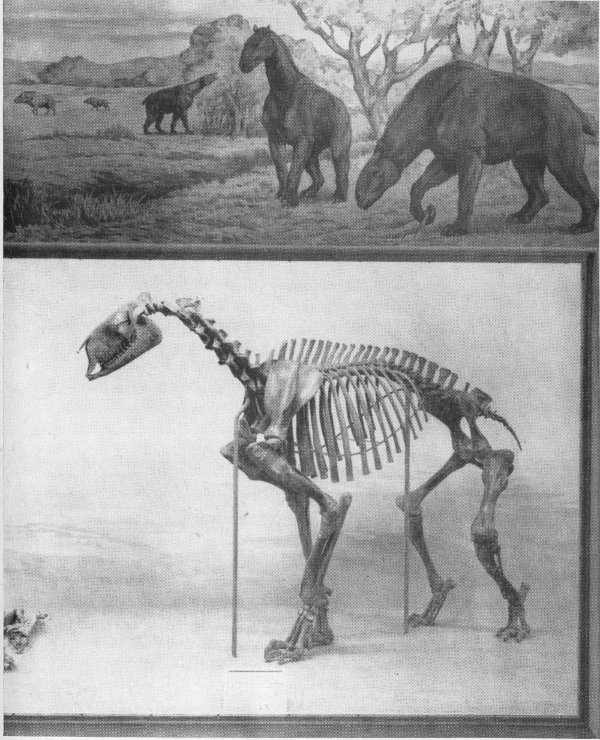 Titanotheres are represented in our collection by the skeletons of the large, horned type which was the last of the race and destined to extinction by the middle of the Oligocene period. Smaller hornless varieties of Eocene time are illustrated by skulls. This family of ungulates had an unprogressive dental equipment, and a small brain in a flattened skull. The molar teeth readily distinguish the group from other ungulates and enable us to trace the relationship between earlier and later varieties. These teeth were of a type which is soon destroyed by wear, and it is evident that the animals survived only so long as their environment provided them with an abundance of soft vegetation.