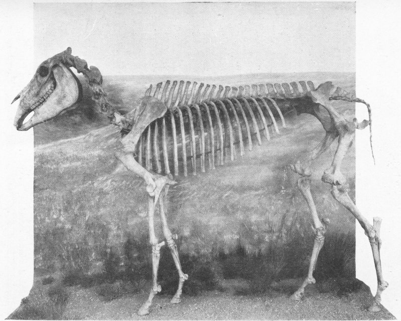 Eohippus, the “dawn horse” as it has been called, is one of the oldest and best known of the American horses. Its relation to existing members of the family can be traced by means of changes in tooth structure as well as in the gradual reduction in the number of toes that is seen among intermediate forms. Its ancestors some day may be positively identified in that group of generalized, primitive, five-toed, hoofed mammals which are known to have lived at the beginning of the mammalian era, but such identification has not yet been established. Even Eohippus bore little resemblance to the familiar horse of today. Its height was only eleven inches, and in body form it had much of the appearance of a modern dog. There were four toes on the front foot, one of them decidedly shorter than the others but complete in all its parts, and evidently capable of service in carrying a portion of the animal’s weight. The hind foot had three complete toes and a tiny remnant of a fourth which could not have been apparent externally.