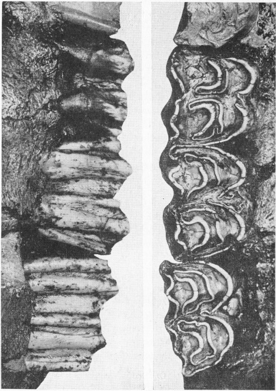 The difference between mastodons and mammoths is most readily recognized in the structure of the grinding teeth, the molars and pre-molars. In the mastodon these teeth are of the short-crowned type, while in the mammoths, as in the modern elephants, they are long-crowned. The difference between these two types of molars has been described with reference to horses, and the change from the older to the modern form may be regarded as coming about in the same general way, through a series of gradual modifications. In both horse and mammoth the final development shows internal enamel extending from the grinding surface nearly to the roots. Otherwise, however, there is almost no resemblance, for the mammoth tooth is made up of flattened enamel plates, the number of which is variable for different species. In the jaws of a very young individual these plates may be seen as separate parts. As the tooth continues to grow, the plates become cemented together, and when the ends of the plate are worn down it may be observed that each consists of a layer of enamel surrounding a flat central core of dentine. The type of construction is rather more obvious in the mammoth tooth than in that of a horse, partly because of the larger size, and partly because of the relative simplicity of construction.