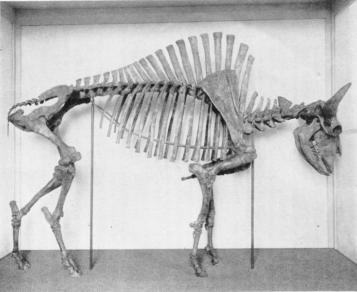 Of the even-toed ungulates there are also several types illustrated by complete skeletons. Merycochoerus, the subject of one of our mounted groups, represents the oreodonts, a large family of mammals whose history begins with the Upper Eocene and ends in the Lower Pliocene. The oreodonts were small animals, rather pig-like in form and quite common in the western plains region shortly after the time of the titanotheres. Ancient swine are represented in our exhibits by two mounted skeletons which were obtained from northeastern Colorado, where the bones were found associated with rhinoceros and titanothere remains. Some of these animals were of very large proportions, and the entire family is commonly known as the “giant pigs.”
