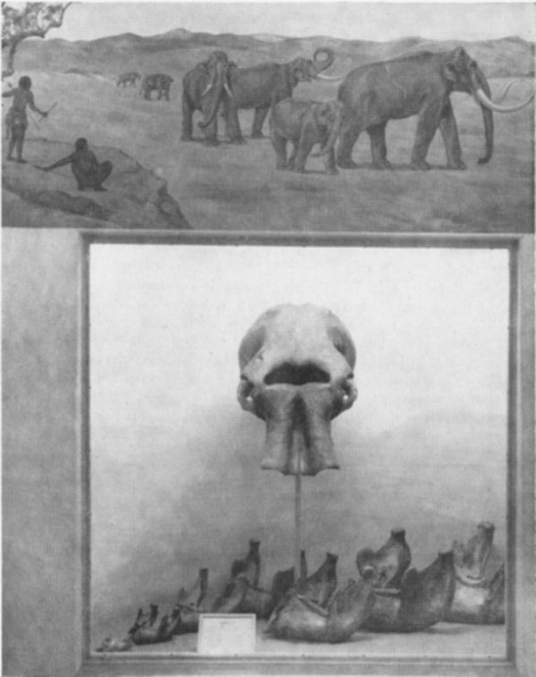 There is abundant evidence to indicate that the great elephants of Pleistocene time were hunted by primitive Americans whose only weapons were darts or spears tipped with points of stone. A skull and the lower jaws of several mammoths are shown here.
