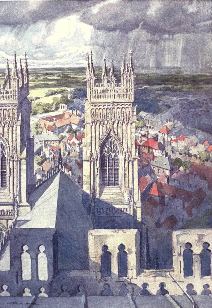 The view is taken from the great central tower, whose parapet shows in the foreground with the roof of the nave and western towers beyond. Bootham Bar and part of the city wall are on the right, and between the towers can be seen the roofs of the Tudor building known as the King’s Manor.