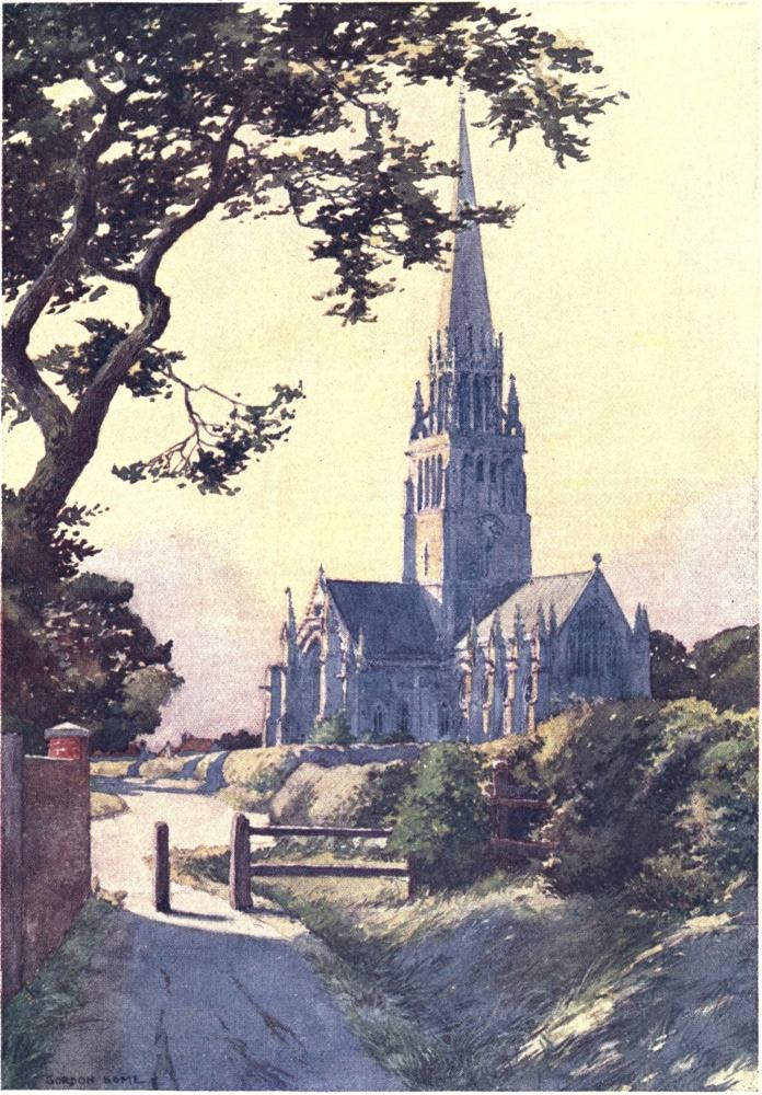 The church, designed by Mr. Temple Moore, is carried out in the style of the Decorated period in a stone that is neither red nor pink, but something{26} in between the two colours. The exterior is not remarkable, but the beauty of the internal ornament is most striking. Everywhere you look, whether at the detail of carved wood or stone, the workmanship is perfect, and without a trace of that crudity to be found in the carvings of so many modern churches. The clustered columns, the timber roof, and the tracery of the windows are all dignified, in spite of the richness of form they display. Only in the upper portion of the screen does the ornament seem a trifle worried and out of keeping with the rest of the work.