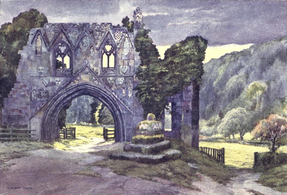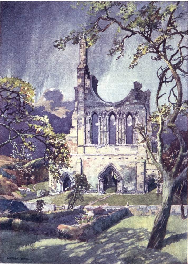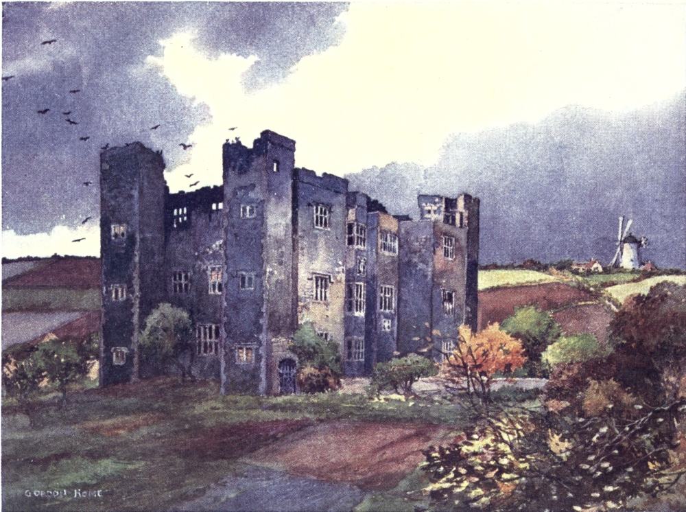 As we continue towards the setting sun, the deeply-indented edges of the Wolds begin to appear, and the roads generally make great plunges into the valley of the Derwent. The weather, which has been fine all day, changes at sunset, and great indigo clouds, lined with gold, pile themselves up fantastically in front of the setting sun. Lashing rain, driven by the wind with sudden fury, pours down upon the hamlet lying just below, but leaves Wharram-le-Street without a drop of moisture. The{27} widespread views all over the Howardian Hills and the sombre valley of the Derwent become impressive, and an awesomeness of Turneresque gloom, relieved by sudden floods of misty gold, gives the landscape an element of unreality.