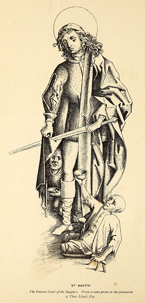 As an exemplification of the legend of Saint Martin might be acceptable to many readers, it has been thought fit to select, as an appropriate embellishment, one of the oldest figures of the Saint that remain, and to place it before the title of the work. This print has been copied with scrupulous fidelity from an ancient engraving in copper, in the truly valuable collection of Thomas Lloyd, Esq., by a German artist, whose name unfortunately has not been preserved, and who probably executed it between the years 1460 and 1470. In this instance the story has not been correctly adhered to, for the designer of the print has there introduced a couple of beggars; an error that is sufficiently {14} compensated by the variety it affords of the mendicant costume, one of these fellows making use of a creeper and dish, the other of a crutch. A later print of this subject, and of extreme curiosity on all accounts, may likewise be consulted. It is from a design by Jerom Bosche, an artist of grotesque celebrity, and represents Saint Martin in a boat full of beggars, with crowds of others on shore, in every possible form and attitude. It is accompanied with the following inscription, in the Flemish language: "The good Saint Martin is here represented among the crippled, nasty, wretched tribe, distributing to them his cloak, instead of money; the miserable crew contending for the spoil."