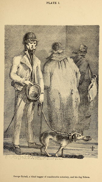 Dyball was remarkable for his leader, Nelson, whose tricks displayed in an extraordinary degree the sagacity and docility of the canine race. This dog would, at a word from his master, lead him to any part of the town he wished to traverse, and at so quick a pace, that both animals have been observed to get on much faster than any other streetwalkers. His business was to make a response to his master's "Pray pity the Blind" by an impressive whine, accompanied with uplifted eyes and an importunate turn of the head; and when his eyes have not caught those of the spectators, he has been seen to rub the tin box against their knees, to enforce his solicitations. When money was thrown into the box, he immediately put it down, took out the contents with his mouth, and, joyfully wagging his tail, carried them to his master. After this, for a moment or two, he would venture to smell about the spot; but as soon as his master uttered "Come, Sir," off he would go, to the extent of his string, with his tail between his legs, apprehensive of the effects of his master's corrective switch. This animal was presented to Dyball by Joseph Symmonds, the blind fiddler, who received him of James Garland, another blind beggar, who had taught him his tricks. Unfortunately for Dyball, this treasure has lately been stolen from him, as is supposed by some itinerant player, and he is now obliged to depend on a dog of inferior qualifications, though George has declared him to "Shew very pretty for tricks."