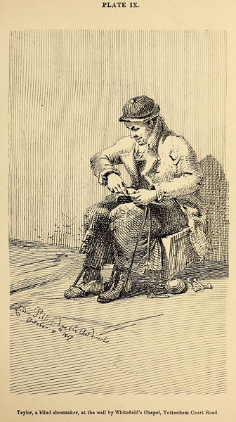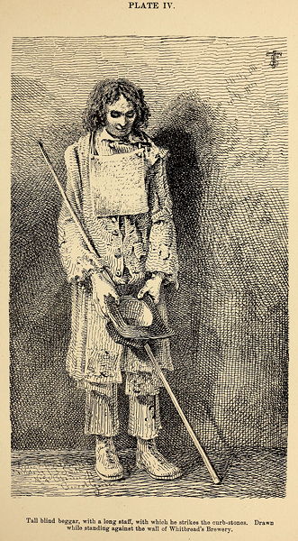 Tall blind beggar, with a long staff, with which he strikes the curb-stones. Drawn while standing against the wall of Whitbread's Brewery.