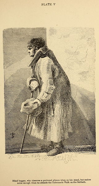 The beggar portrayed in the next plate is a blind man, who remains for many hours successively with his legs in one position. He observes a profound silence when on his stand, but makes noise enough when he attends the Tabernacle Walk on the Sabbath; on the week days, however, he is frequently heard singing obscene songs. He is introduced, with his wife, in the background of George Dyball's plate.