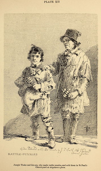 In the year 1566, Thomas Harman, Esq., probably a justice of peace, published a very singular and amusing work, entitled, "A Caveat, or Warning for Common Cursetors (runners) vulgarely called Vagabones;" in which he has described the several sorts of thieving beggars and other rogues with considerable humour, and has collected together a great number of words belonging to what he humorously calls the "leud lousey language of these lewtering luskes and lazy lorrels, wherewith they bye and sell the common people as they pas through the countrey." He says they term this language Pedlar's French, or, Canting, which had not then been invented above thirty years. As the book has lately been reprinted, it will be proper, on this occasion, to use it more sparingly, and to mention only such of Harman's vagabonds as fall under the begging class. These are 1. The Rufflers; particularly mentioned in the Stat. xxvii. Henry VIII. against vagabonds, as fellows pretending to be wounded soldiers. These, says Harman, after a year or two's practice, unless they be prevented by twined hemp, become,—2. Upright Men; still pretending to have served in the wars, and offering, though never intending, to work for their living. They decline receiving meat or drink, and take nothing but money by way of charity, but contrive to steal pigs and poultry at night, chiefly plundering the farmers. Of late, says the author, they have been much whipped at fairs. They attack and rob other beggars that do not belong to their own fraternity, occasionally admitting or installing them into it by pouring a quart of liquor on their pates, with these words, "I do stall thee, W. T., to the rogue, and that from henceforth it shall be lawful for thee to cant for thy living in all places." All sorts of beggars are obedient to them, and they surpass all the rest in pilfering and stealing. 3. Hookers, or Anglers; these knaves beg by day, and pilfer at night, by means of a pole with a hook at the end, with which they lay hold of linen, or any thing hanging from windows or elsewhere. The author relates a curious feat of dexterity practised by one of them at a farm house, where, in the dead of the night, he contrived to hook off the bed-clothes from three men who were lying asleep, leaving them in their shirts, and when they awoke from cold, supposing, to use the author's words, "that Robin Goodfellow had bene with them that night." 4. Rogues; going about with a white handkerchief tied round the head, and pretending to be lame. These people committed various other frauds and impostures, in order to obtain charity. 5. Pallyards; with patched garments, collecting, by way of alms, provisions, or whatever they could get, which they sold for ready money; they are chiefly Welshmen, and make artificial sores by applying spearwort to raise blisters on their bodies, or else arsenic or ratsbane to create incurable wounds. 6. Abraham Men; pretending to be lunatics, who have been a long time confined in Bedlam or some other prison, where they have been unmercifully used with blows, &c. They beg money or provisions at farmers' houses, or bully them by fierce looks or menaces. 7. Traters; or fellows travelling about {13} the country with black boxes at the girdle, containing forged briefs, or licences to beg for hospitals. Some have clouts bound round their legs, and walk as if lame, with staves in their hands. 8. Freshwater Mariners, or Whipjacks; whose ships, says the witty author, were drowned in Salisbury Plain. These counterfeit great losses at sea by shipwreck and piracy, and are chiefly Irishmen, begging with false licences, under the supposed seal of the Admiralty, so artfully constructed as to deceive even the best lawyers. 9. The Counterfeit Crank; who is described at large, with a figure, in another part of this work. 10. Dommerars; chiefly Welshmen, pretending to be dumb, and forcibly keeping down their tongues doubled, groaning for charity, and keeping up their hands most piteously, by which means they procure considerable gains. 11. Demanders for glymmar; who are chiefly women that go about with false licences to beg, as sufferers from fire,—glymmar, in pedlars' language, signifying that element. Many other classes are enumerated in this curious volume, as—priggars of prauncers, swadders, jarkman, patricos, bawdy baskets, autem morts, walking morts, doxies, dells, kynchin morts, and kynchin coes; but all these are rather pilferers than beggars.