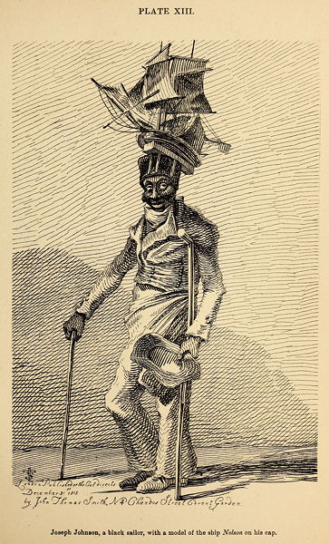 The following plate exhibits Stuart's pupil, George Dyball, a fellow of considerable notoriety. He sometimes dresses as a sailor, in nankeen waistcoat and trousers; but George, like his master, never was a seaman. Stuart taught him to maund, by allowing him to kneel at a respectful distance, and repeat his supplications.