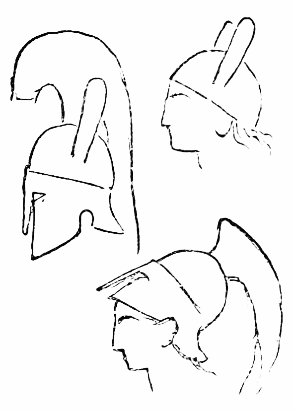 The first helmets were modifications of the Ulysses cap. The material was changed from straw or felt to thick leather or brass. A couple of feathers were sometimes added, and sometimes doubtless the leather{17} or brass was ornamented with gold and precious stones.