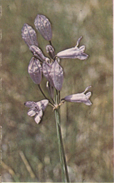 This bright-blue flower, on its long, slender stalk, has a number of common names, such as Wild Hyacinth, Grass Nuts and Spanish Lily. The bulb of this plant has a nutty flavor. It was gathered by the Indians and early pioneers for food in some sections of the country. It is found sparingly in good soil areas.