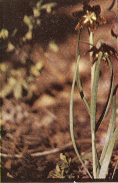 A rather rare lily sometimes called Leopard Lily or Bronze Bell. Its drooping flowers on fairly tall stems are found growing in the Sagebrush areas or in alpine meadows. As they are not very conspicuous, they are often overlooked by visitors. The petals, with their mottled effect in brown, yellow and purple spots, present a remarkable pattern of beauty when observed closely. The odor of the plant is not pleasing to humans, but is no doubt attractive to insects.