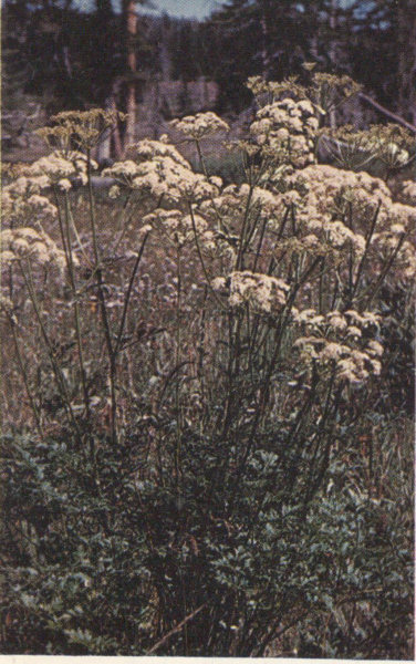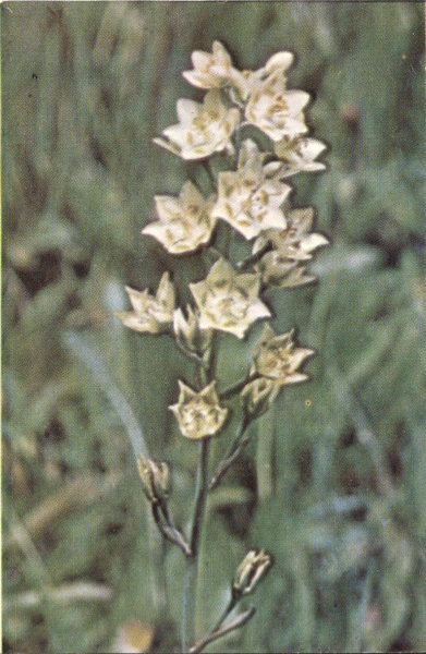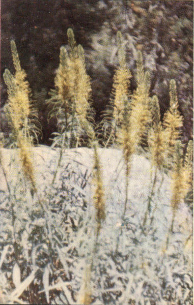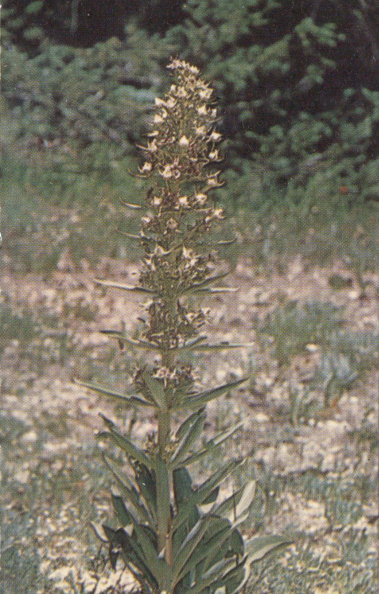 An onion-like plant with a long, loose cluster of small, creamy-white flowers. Its root is shaped much like that of the onion, but is odorless. The plant is poisonous to man and beast. Deathcamas is found mostly in meadows or wet places on the plateaus where it presents a serious danger to grazing cattle and sheep. At Cedar Breaks it blooms during July and August and is fairly common in the alpine meadows.