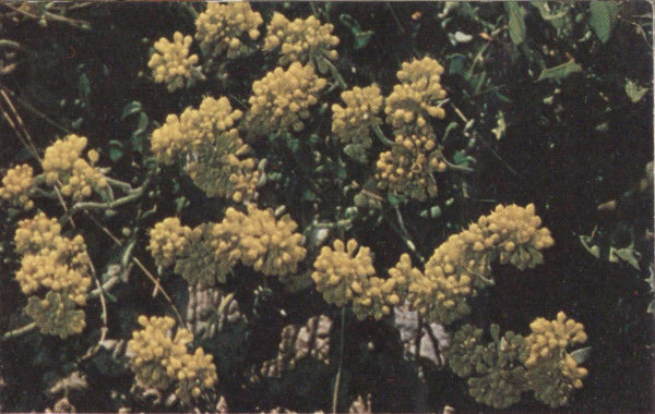 The spreading branches grow close to the ground and help reduce erosion, and the yearly accumulation of leaves adds humus to the soil. The flower head at the top of single stalks, with its many-branched, dense cluster in a lacy pattern, makes a fine floral display of yellow. The flowers are important to the honey bee, and the ripened seeds are diligently sought by the chipmunks, other rodents and several birds.