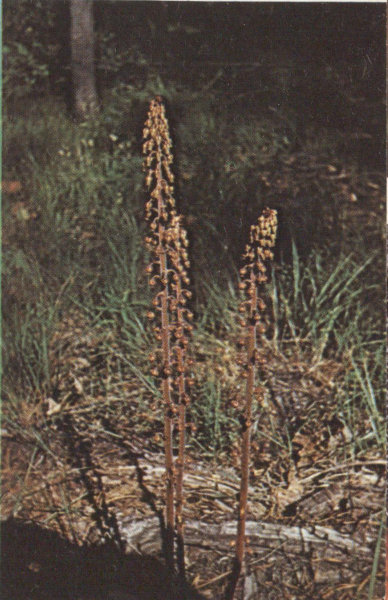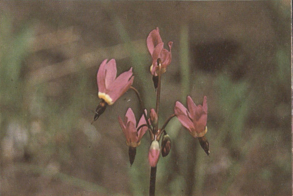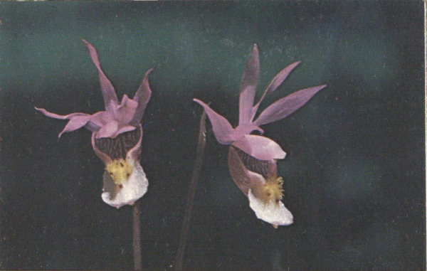 If you travel to the mountains early in June or July, you may be lucky enough to find this beautiful flower, the dainty Calypso or Fairy Slipper Orchid, as it blooms in the dense woods of Spruce and Pine or in the deep canyons along shady streams at elevations above 6,000 feet. The flowers grow singly on stems 4 to 6 inches high and have only one large leaf. The plant takes part of its food from decaying wood or other organic matter.