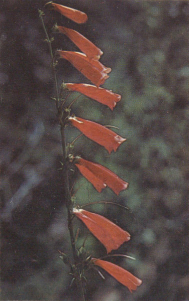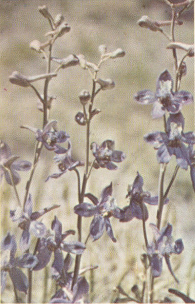 Larkspurs are found abundantly at Cedar Breaks during July and August in the alpine meadows of the Monument. The leaves are very similar to those of the Monkshood, but the flowers differ in color and shape. The single spur of one of the sepals is the marked feature of the Larkspur. Color and size vary greatly for the different species; but the most common variety at Cedar Breaks is 2 to 3 feet tall, and the flowers are a purplish blue.