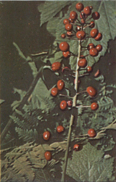 This plant may be found in the shady forest of good moisture. It is about one to two feet tall with handsome leaves but rather inconspicuous heads of creamy-white flowers. The conspicuous bright-red or waxy-white berries about the size of peas in a dense cluster make a very attractive display in late summer. The berries are somewhat poisonous, hence the name Baneberry.