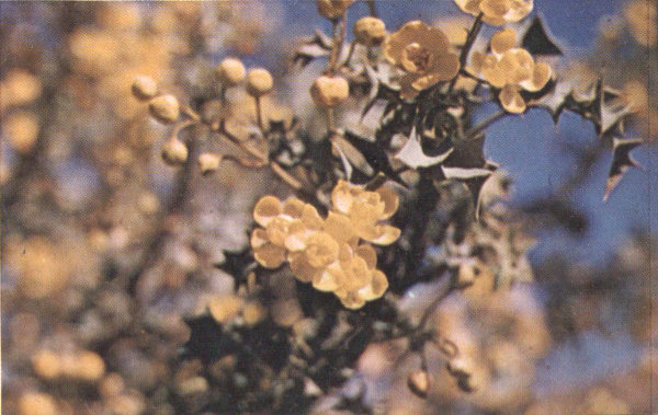 Because of its hollylike leaves, this dwarf shrub is sometimes called the Holly Grape, but it is more commonly known as the Oregon Grape. A rather prostrate growth form accounts for a third common name; namely, Creeping Barberry.
