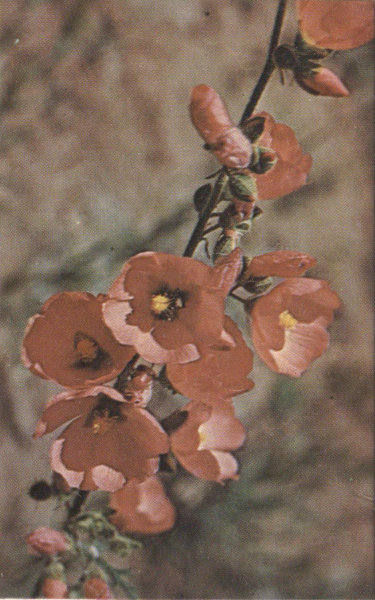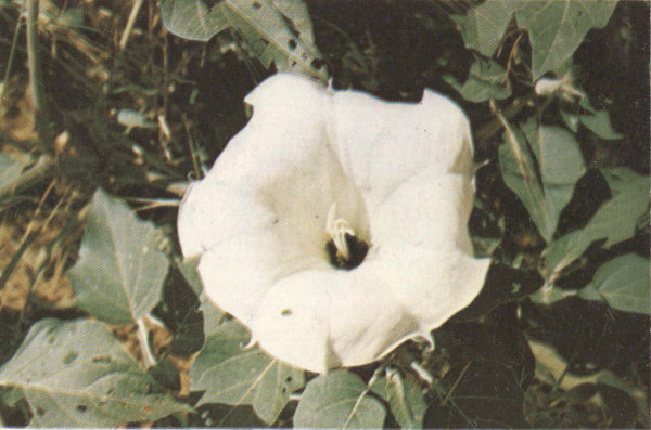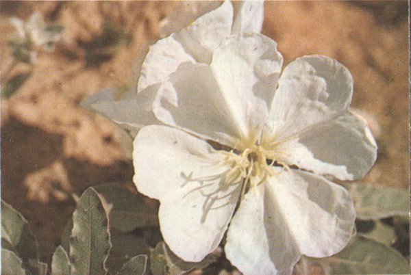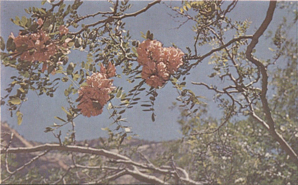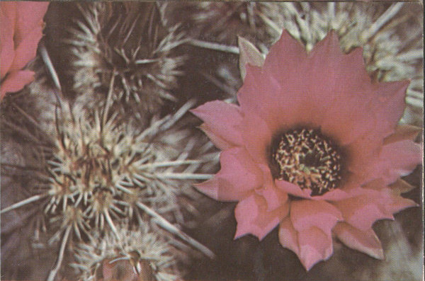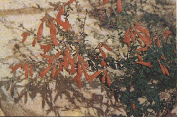 Closely resembling the cultivated variety of Four-O’Clock, this plant, with its abundance of brilliant magenta-colored flowers, is one of the spectacular sights in May or early June. It is a sturdy perennial with thick, glossy-green leaves spreading low over the ground. The south-facing slopes in the Sonoran Zones are its most common habitat, but it is also found in the broken lava fields. Being a night bloomer, the flowers close during the bright daylight hours and open at about four o’clock in the afternoon. Its blooming season is generally brief, about two or three weeks, but it sometimes blooms twice in the same summer.
